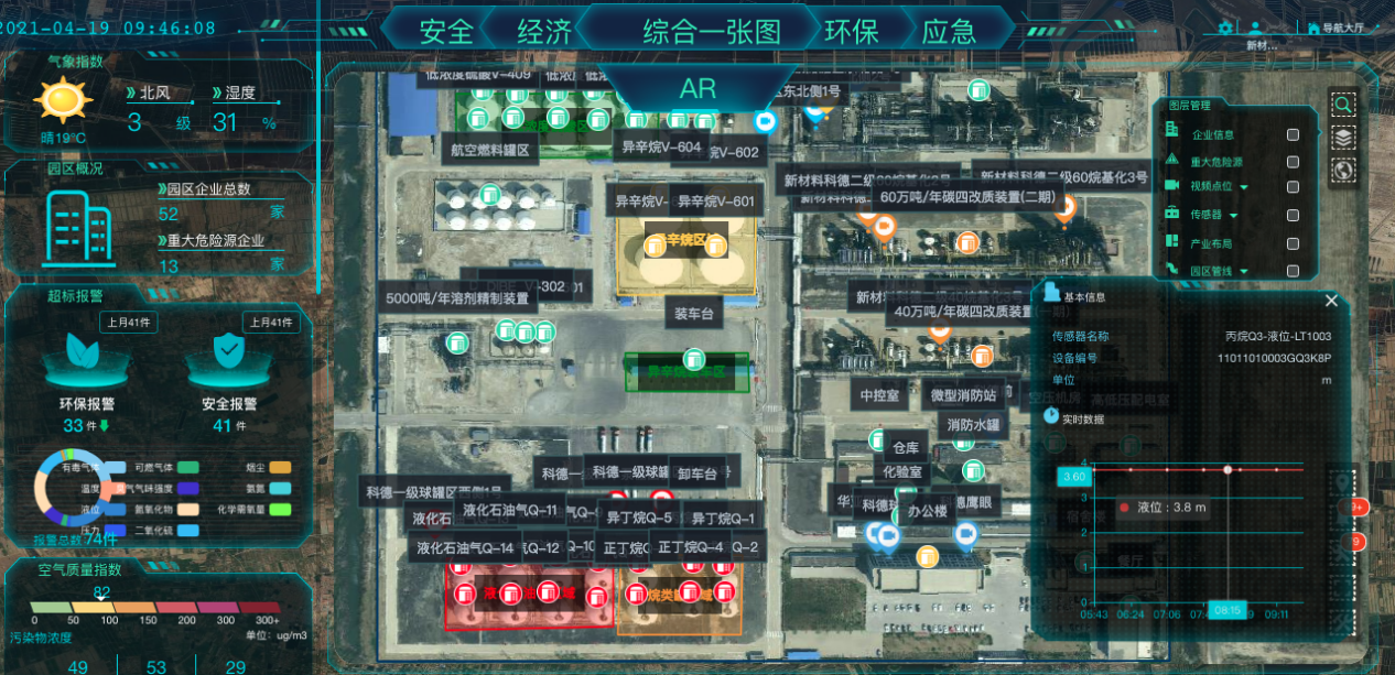 六是綜合防控一張圖,讓隱患無處遁形。“危化品園區(qū)監(jiān)管子系統(tǒng)”可通過“一張圖”隨時(shí)查看?;穲@區(qū)全方位實(shí)時(shí)數(shù)據(jù),同時(shí)借助物聯(lián)網(wǎng)感知設(shè)備,可實(shí)現(xiàn)24小時(shí)監(jiān)測(cè)其化學(xué)氣體濃度、空氣質(zhì)量、電氣、液壓、液位、氣壓、濕度、溫度、風(fēng)向、風(fēng)速等數(shù)據(jù),根據(jù)既定的數(shù)據(jù)模型,計(jì)算分析后,生成實(shí)時(shí)狀態(tài)評(píng)估報(bào)告,進(jìn)而督促企業(yè)進(jìn)行整改。
