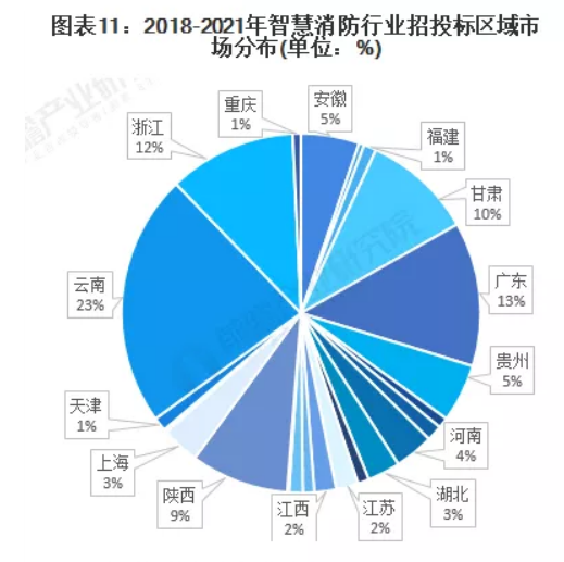 從我國(guó)智慧消防招投標(biāo)項(xiàng)目區(qū)域競(jìng)爭(zhēng)格局來(lái)看,市場(chǎng)整體較為分散,其中,2018-2021年云南地區(qū)智慧消防項(xiàng)目中標(biāo)金額占比達(dá)23%,排名第一;其次為廣東省,占比達(dá)13%;浙江地區(qū)排名第三,智慧消防項(xiàng)目中標(biāo)金額占比達(dá)12%。