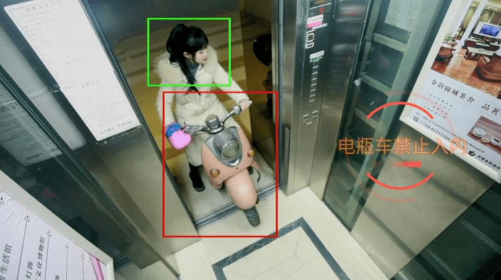 梯控系統(tǒng)前端設(shè)備嵌入電動(dòng)車識別算法,對電動(dòng)車精確檢測分析,可實(shí)現(xiàn)對電動(dòng)車的分析識別,實(shí)時(shí)預(yù)警周界區(qū)域內(nèi)電動(dòng)車闖入事件。當(dāng)有電動(dòng)車進(jìn)入電梯監(jiān)測范圍內(nèi)可進(jìn)行智能報(bào)警提示,同時(shí)電梯發(fā)出語音信息:“請將電動(dòng)車推出電梯,謝謝合作”。
