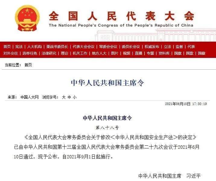 《全國人民代表大會常務委員會關于修改<中華人民共和國安全生產(chǎn)法>的決定》已由中華人民共和國第十三屆全國人民代表大會常務委員會第二十九次會議于2021年6月10日通過,現(xiàn)予公布,自2021年9月1日起施行。