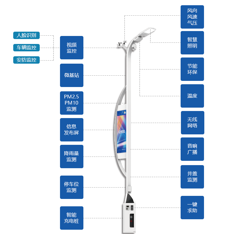 新型智慧照明是一種集成各種信息設(shè)備技術(shù)創(chuàng)新集成應(yīng)用產(chǎn)品,是在路燈桿的基礎(chǔ)上結(jié)合多類感知設(shè)備(4G/5G微基站、WIFI設(shè)備、智慧照明、傳感器、視頻監(jiān)控、RFID、公共廣播、信息發(fā)布、充電樁等),如同城市的神經(jīng)末梢充分對(duì)信息進(jìn)行采集、發(fā)布、傳輸形成一張智慧感知的網(wǎng)絡(luò)。通過(guò)深度整合多類型資源,實(shí)現(xiàn)資源的“共享、集約、 統(tǒng)籌”,大幅度的降低城市建設(shè)成本提升城市運(yùn)維效率,為智慧城市的建設(shè)推進(jìn)提供了良好基礎(chǔ)。